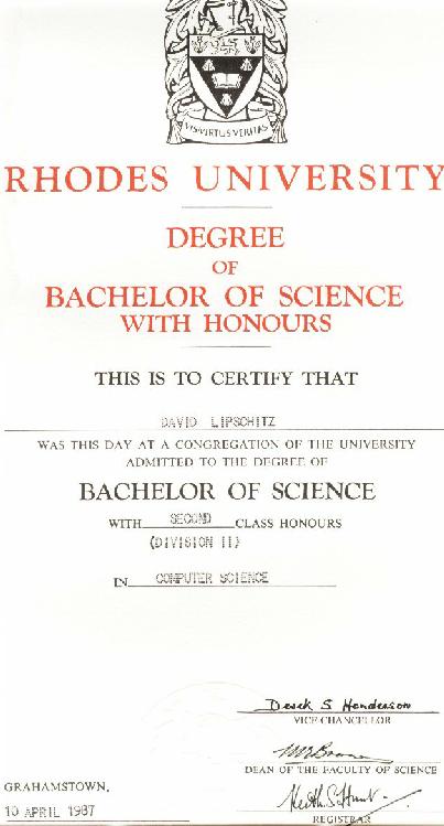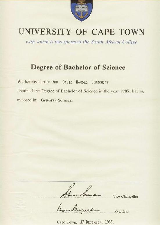 Dec. 1985: B Sc Computer Science - University of Cape Town